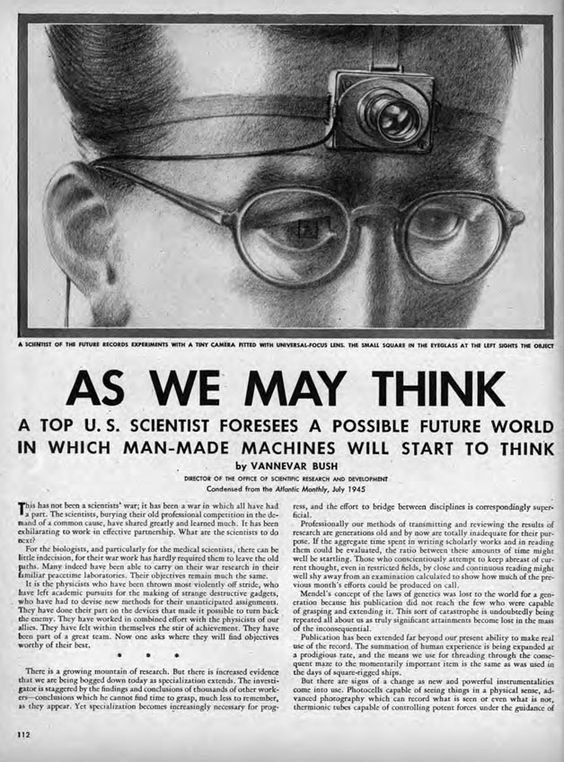 مقالة نشرت عام 1945 بعنوان "كما قد نفكر" نشرت في مجلة أتلانتيك الشهرية، كتبها فانيفار بوش حيث تنبأ بشكل تقريبي بوجود أجهزة الكمبيوتر الحديثة والهواتف الذكية والإنترنت.