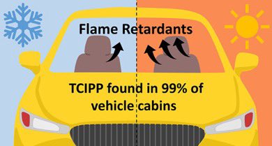وُجدت مادة كيميائية معينة مانعة للاشتعال في 99% من السيارات المحللة بالإضافة إلى مواد أخرى مشتبه بها في التسبب بالسرطان وتضر بالجهاز العصبي والتناسلي.