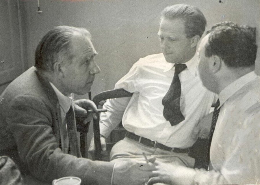 نيلز بور وفيرنر هايزنبرغ وولفغانغ باولي يناقشون ميكانيكا الكم عام 1938.