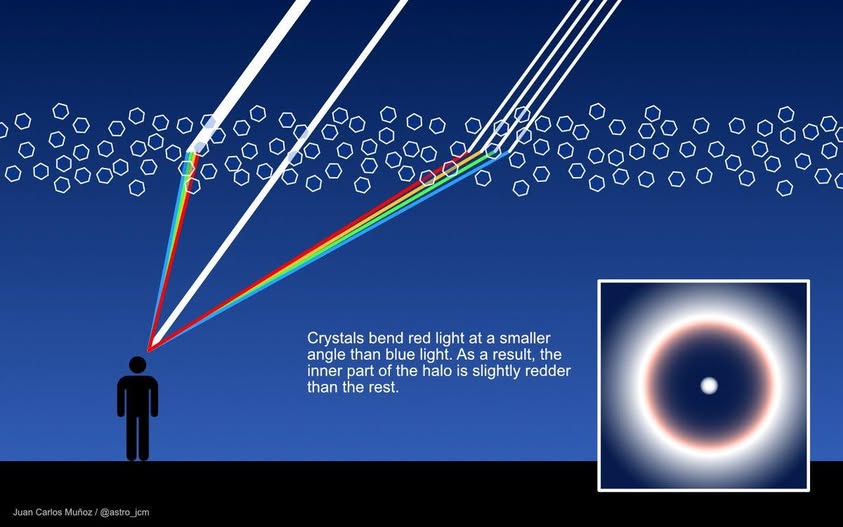 عندما يحيط بالشمس حلقة ضوئية تعرف بالهالة، يكون السبب انكسار الضوء داخل بلورات الجليد السداسية في السحب العالية. ما يميز هذه الظاهرة أن كل لون من ألوان الطيف ينكسر بزاوية مختلفة؛ فالضوء الأحمر ينحني بزاوية أصغر من الأزرق، مما يجعل الحافة الداخلية للهالة مائلة إلى الاحمرار بينما تميل الحافة الخارجية إلى الزرقة. هذه النتيجة ليست مجرد مشهد بصري بديع، بل دليل على دقة القوانين الفيزيائية التي تحكم تفاعل الضوء مع المادة في الغلاف الجوي للأرض.