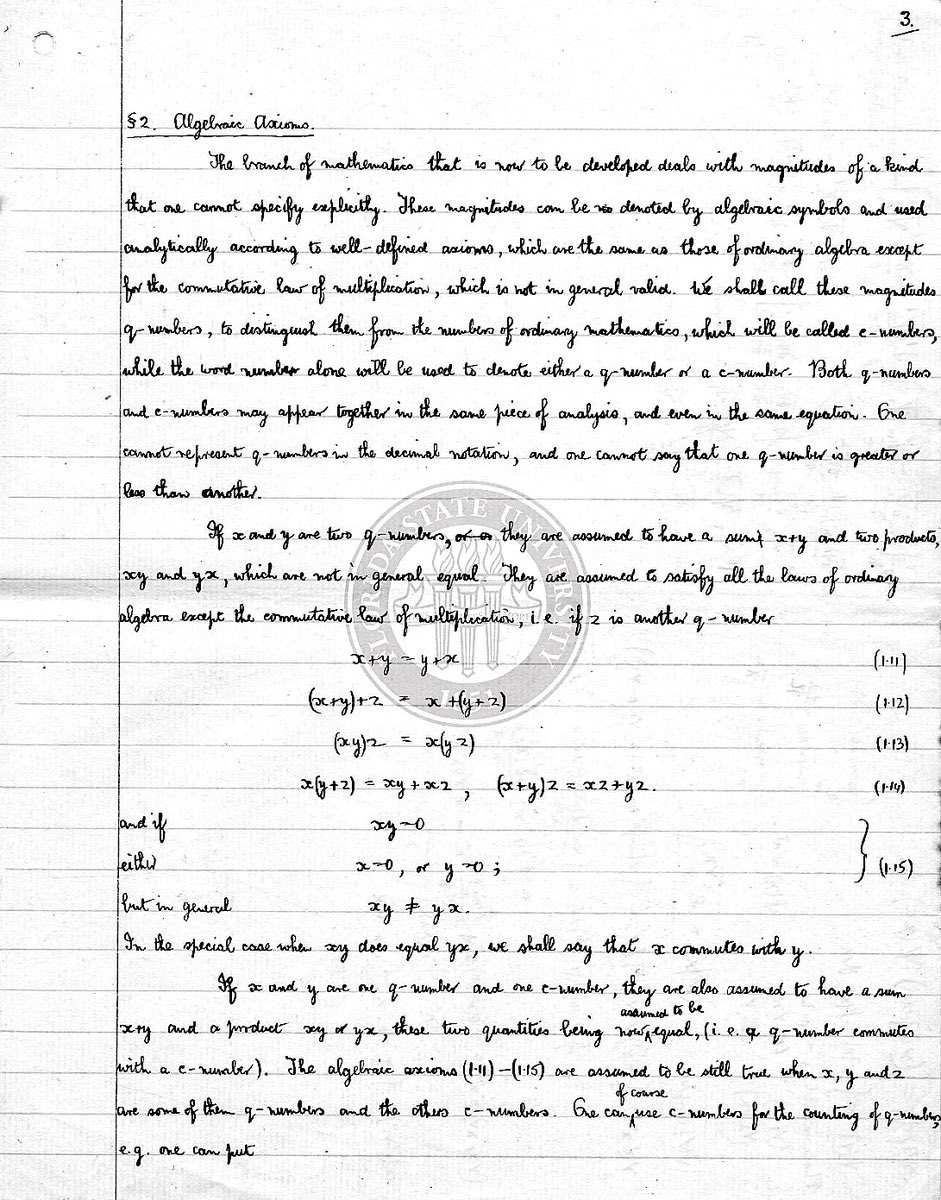 لم تتم طباعة أطروحة دكتوراه بول ديراك. كانت مكتوبة بخط اليد وتم تقديمها في عام 1926. وكان عنوان الأطروحة ببساطة "ميكانيكا الكم". ديراك هو أحد الآباء المؤسسين لميكانيكا الكم.