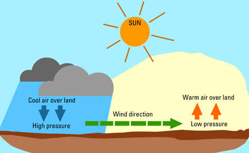 حركة الرياح هي نوع من الحمل الحراري حيث ينتقل الهواء من مناطق الضغط المرتفع إلى مناطق الضغط المنخفض بفعل تسخين أشعة الشمس وتفاوت درجة الحرارة.