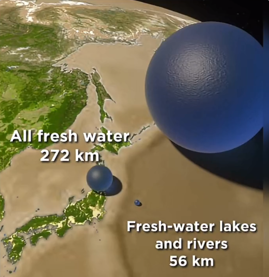 لو جمعت الماء كله من البحار والمياه العذبة فوق وتحت الأرض لكان نصف قطر الكرة المائية 1,385 كم. الكرة المتوسطة الحجم تمثل كل الماء العذب فوق وتحت الأرض بما فيها الأنهار، قطرها 272.8 كم. أما الصغيرة فهي الأنهار فقط، 56.2 كم.