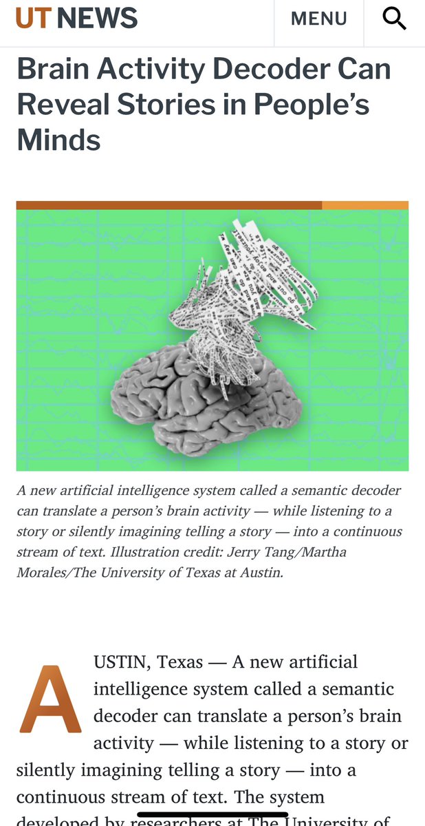 نظام ذكاء اصطناعي حديث أطلقوا عليه اسم «وِحدة فك التشفير» يستطيع ترجمة أفكار البشر وتحويله إلى نص مكتوب، بمعنى أنه يستطيع قراءة أفكارنا دون وجود شريحة في الدماغ.