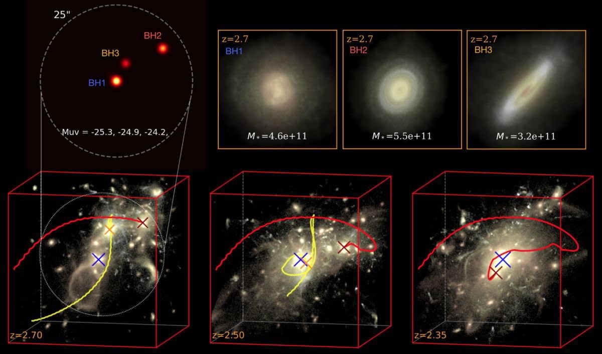 راقب العلماء نظامًا ثلاثي المجرات مندمجًا ، وباستخدام محاكاة حاسوبية عالية الدقة تسمى أستريد ، اظهرت النتائج تكون ثقبًا أسودًا تبلغ كتلته 300 مليار ضعف كتلة الشمس.