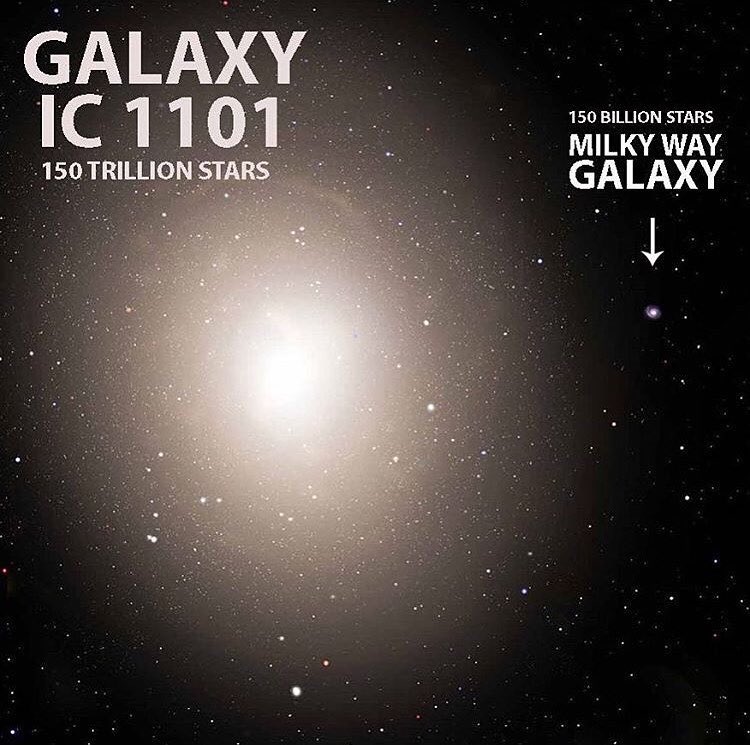 النقطة الصغيرة التي على اليمين مجرة درب التبانة وبها نظامنا الشمسي وأكثر من 150 مليار نجم والبالغ قطرها 100ألف سنة ضوئية ، وفي الجهة اليسرى المجرة الكبرى IC1101 التي يبلغ قطرها حوالي 6 مليون سنة ضوئية وبها أكثر من 150 ترليون نجم !