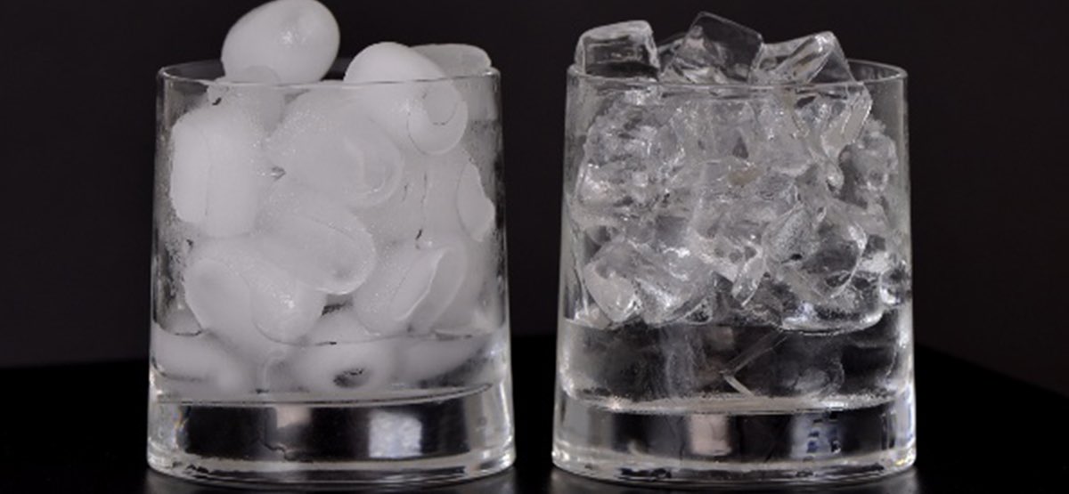 الثلج الصافي يتشكل من تجمد ماء نقي بينما يحتوي الثلج الغامق على شوائب وفقاعات هواء، يذوب الثلج الغامق أسرع من الصافي بسبب الشوائب كما أن الهواء المحبوس فيه والذي يحمل رائحة الثلاجة يترك طعم في المشروبات ويتفاعل مع المشروبات الغازية بقوة..... لصنع مكعبات ثلج صافي اغلي الماء قبل تجميده.