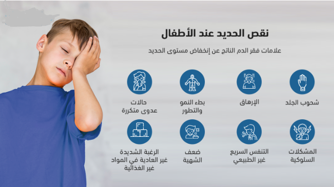قد يضعف نقص الحديد الشديد من قدرة أداء جسم الطفل لوظائفه، ومع ذلك، لا تظهر معظم علامات وأعراض نقص الحديد لدى الأطفال حتى تحدث أنيميا نقص الحديد. لكن في حال كانت لدى الطفل عوامل خطورة للإصابة بنقص الحديد، فتحدث مع طبيبه.