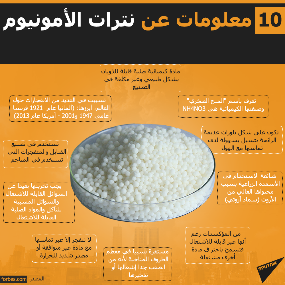نترات الأمونيوم هو مركب كيميائي له الصيغة NH₄NO₃، ويوجد في الشروط القياسية على شكل بلورات عديمة اللون سهلة الانحلال في الماء وهي تتسيّل بسهولة لدى تماسها مع الهواء. يستخدم المركب بشكل أساسي في صناعة المتفجرات المستخدمة في المناجم والإنشاءات الهندسية؛ كما يستخدم نظراً لمحتواه العالي من النتروجين في تركيب الأسمدة.