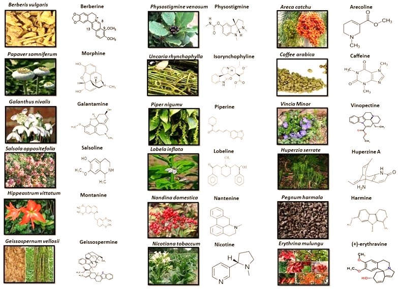ومن مميزات القلويدات أن لها خواص فسيولوجية مميزة فبعضها منشط مثل الكافيين وبعضها مخدر مثل الكوكايين والمورفين وبعضها مهدئ ومسكن مثل الكودايين والطب الشعبى استخدم خلاصة الافيون كأول عقار لأغراض التنويم منذ الأزل وحاليا تم التعرف على التركيب الكيميائى لأكثر من 90% منها.