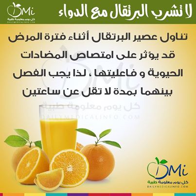 يمكن ان يسبب تناول المرضى لعصير البرتقال بعرقلة امتصاص الادوية لذا تجنب تناول الدواء مع العصائر والافضل ان تفصل ساعتين الى ساعة على الاقل بين الدواء والعصير