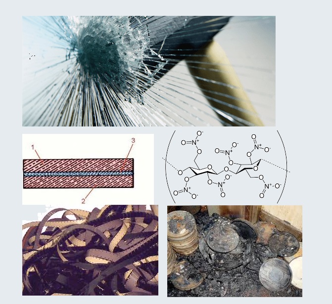 أسقط كيميائي فرنسي قارورة زجاجية على الأرض ودُهش عندما تفتت الزجاج ولكنه لم يتناثر وبقي متماسكاً. اكتشف لاحقاً أنه استخدم القارورة مسبقاً لحفظ نترات السيليلوز والتي خلقت بدورها حاجزاً واقياً. أما اليوم فتتم معالجة الزجاج الأمامي للسيارات بنفس الطريقة لجعله لا يتناثر أبدا عند كسره!.