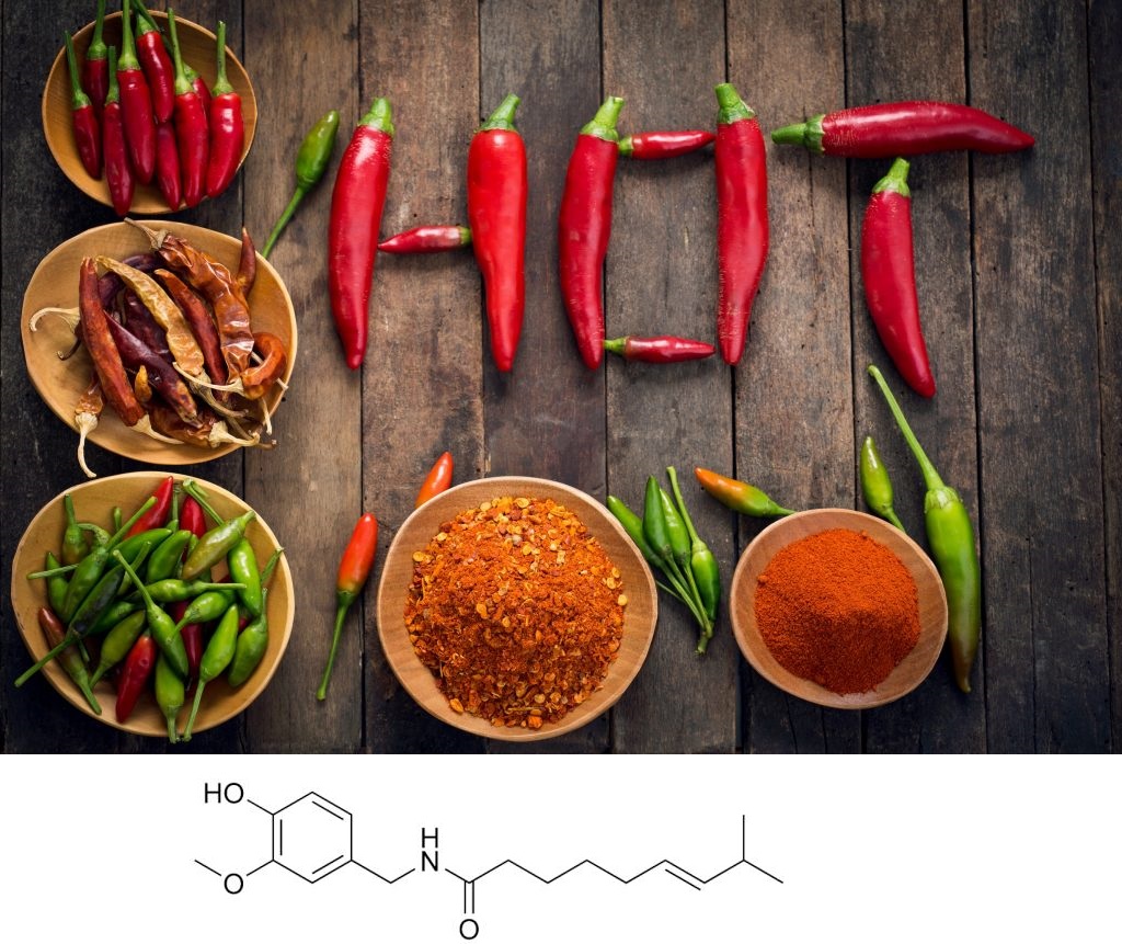 يحصل الفلفل الحار على حرارته من جزيئة تسمى capsaicin. تعمل هذه الجزيئة كمهيج للثدييات، بما في ذلك البشر، بينما تفتقر الطيور إلى المستقبل المسؤول عن هذا التأثير وتكون معفية من احساس الحريق نتيجة التعرض.