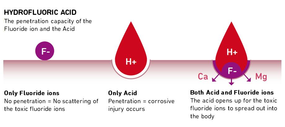 حمض الهيدروفلوريك هو مادة أكالة بحيث أنه يذيب الزجاج. وعلى الرغم من أن حمض الهيدروفلوريك مادة أكالة فإنه يعتبر “حمض ضعيف”. ويمكنه ان يذيب جسم الانسان وحرقه بكل سهولة