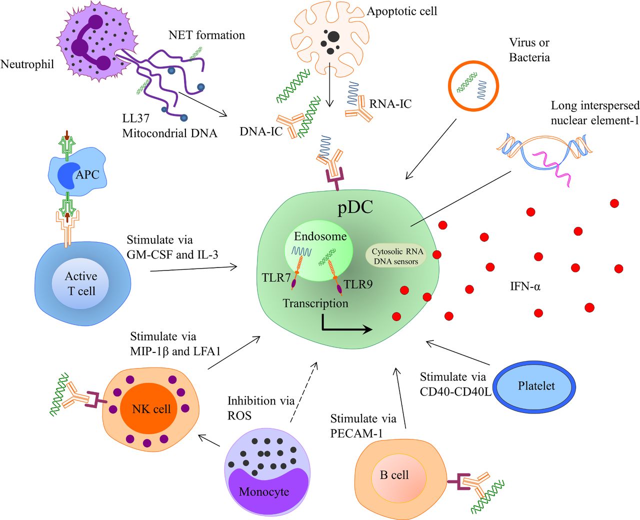 الإنترفيرونات هي سيتوكينات تقوم بتنشيط خلايا لصنع بروتينات تجعلها قادرة على مقاومة الإصابة بفيروسات معدية. نعرف منها انترفيرونات (IFN ɑ/β/ɤ), وهي تنتج من خلايا الدم البيضاء (لويكوسيدات) (وعلى الأخص الخلايا الوحيدة "مونوسيت" و خلايا أكولة كبيرة macrophage و "فيبروبلاست" Fibroblast ولها مقاومة كبيرة ضد الفيروسات ، كما لها قدرة على تهدئة الأورام.