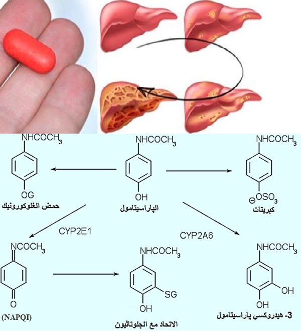 تحدث سمية الباراسيتامول نتيجة للاستخدام المفرط أو الجرعة الزائدة من العقار المسكن الباراسيتامول مما يتسبب في المقام الأول في إصابة الكبد بتسمم وبفشل حاد نتيجة التمثيل الغذائي (الأيض) ليتكون مركب، ن-اسيتيل- بي- بنزوكينونيمين ( NAPQI ) الذي يستنزف مضاد الأكسدة الطبيعي بالكبدالجلوتاثيون. قد لا تظهر أعراض في البداية بعد جرعة زائدة. و قد تظهراعراض غير محددة مثل آلام مبهمة بالبطن وغثيان. مع تقدم المرض ، تبدأعلامات الفشل الكبدي ، وهذه تشمل انخفاض نسبة السكر في الدم وزيادة حموضة الدم وسهولة النزف