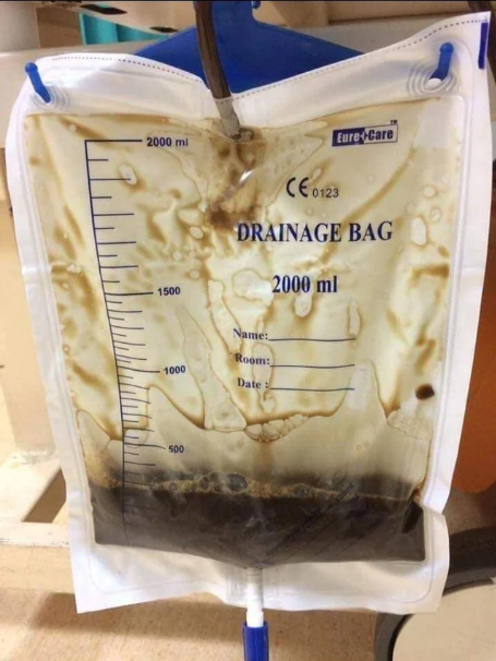 هذه الصورة مأخوذة من سائل يتسرب من رئتي مدخن شره يعاني الآن من سرطان الرئة في المرحلة النهائية (stage 4 lung cancer) . السائل هو في الواقع القطران (tar ) الذي يستقر في الرئتين نتيجة تراكم مخلفات مادة النيكوتين ونتيجة أيضا الانصباب الجنبي الخبيث أو ( Malignant pleural transfusion).