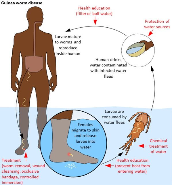 المسبب لهذا المرض هو دودة غينيا ( guinea worm ) حيث تترك هذه الدودة يرقاتها في الماء فيصبح الماء ملوثاً بها وعند دخولها الى الجسم لا يلاحظ المصاب اي شيء لمدة سنة كاملة ( فترة نمو الدودة لطورها الكامل ) . بعد ذلك يلاحظ المصاب اورام كبيرة وحارقة تحدث غالبا في الساق او القدم وتبقى الدودة منتظرة المصاب يضع قدمه المصابة في الماء لتبريد قدمه وعند وضع قدمه تخرج الدودة او مجموعة الديدان رأسها وترش يرقاتها في الماء لتكرار دورة حياتها .عند اكتمال نموها يصل طولها…