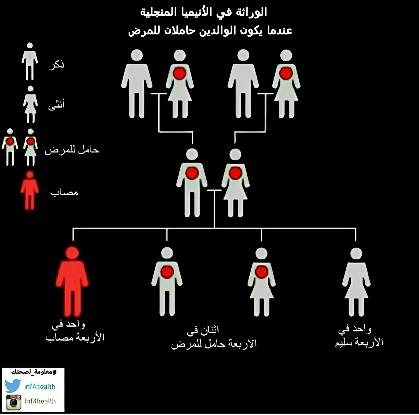 في هذه الحالة يكون الوالدين حاملان للمرض.الحامل للمرض يعني أنه يحمل الجين المسبب للمرض لكنه غير مصاب بالمرض. يظهر في هذه الحالة أن واحد من اربعة من الاطفال سيكون مصاب و اثنين يحملان المرض و واحد سليم.