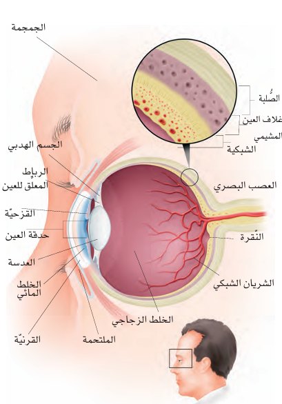 يُظهر هذا الرسم التوضيحي الملامح الاساسية للعين . والاوعية الدموية التي تغذي الشبكية هي غالباً ما تتضرر بفعل مرض السكري .