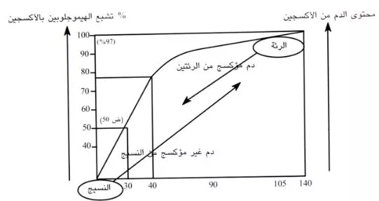 منحنى انفكاك الأكسجين من الهيموجلوبين: يعبّر منحنى انفكاك الأكسجين من الهيموجلوبين على العلاقة بين الضغط الجزئي لغاز الأكسجين ونسبة تشبع الهيموجلوبين بالأكسجين عند مرور الدم من الرئتين إلى النسيج. يتم الحصول على هذا المنحنى النموذجي تحت ظروف التنفس الاعتيادي التي تكون فيها درجة حرارة الجسم (37.5م )، والتركيز الأيوني للدم (PH = 7.34)" والضغط الجزئي لثاني أكسيد الكربون = 40 مم / ز.
