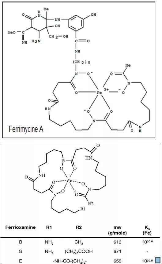 مضادات حيوية ببتيدية التي تكون مركبات معقدة مع المعادن، والأنواع التي ترتبط مع الحديد تحوي على مجموعة Hydroxamic Acid مكونة معقدات Ferrihydroxamate الموضحة في الصورة ادناه. وتعمل هذه المواد كمحفزات للنمو وينتج بعضها من Strep. verticillus و Streptomyces pilosus وتستعمل المضادات لمعالجة نقص الحديد، وكذلك تستعمل في الترب التي تعاني من نقص الحديد، وأهم المضادات في هذه المجموعة Bleomycins التي هي بمثابة ببتديات سكرية تستعمل كمضادات للأورام أيضاً.