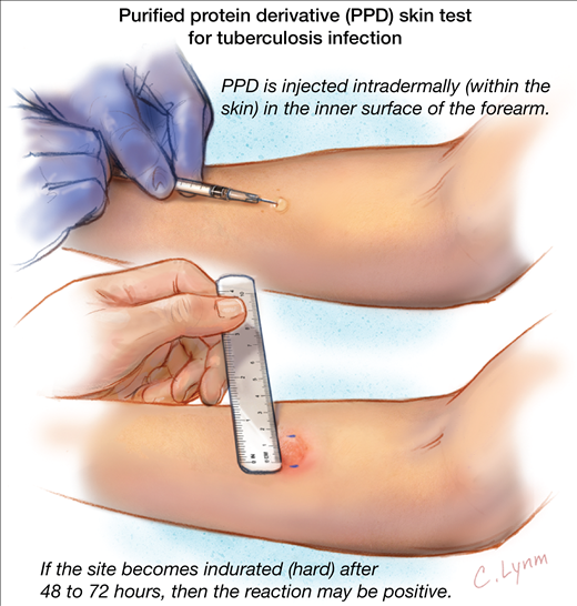 Tuberculin Test اختبار السل الجلدي فحص عن الاصابة بالسل يستعمل فيه مستخلص عصيات السل في الكليسرول والمستخلص مشتق بروتيني نقي (Purified Protein Derivative( PPD. اول استعمال له وصفه Robert Koch كان عام 1890 ، ثم طور من قبل العالم Charles Mantoux وسمي باسمه . الجرعة القياسية 5 وحدات في 0.1 مللتر ، وعند الحقن بالجلد يقاس التفاعل بقياس قطر المنطقة او الندبة المتكونة بالملمتر بعد 48-72 ساعة وتسجل وفق اعتبارات خاصة والتفاعل يمثل مناعة خلوية متاخرة Delayed (Cellular) Hypersensitivty Reaction.