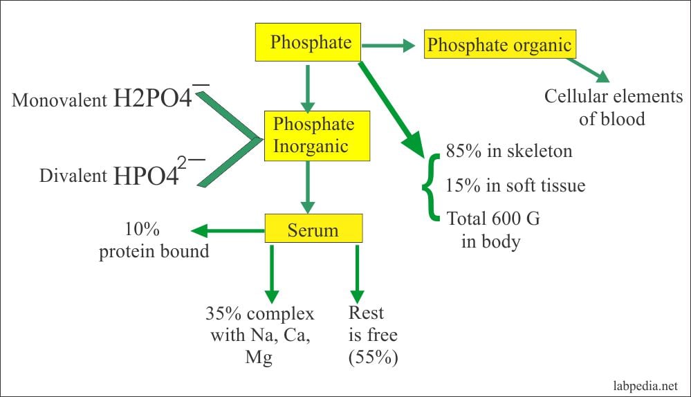 يعتبر الفوسفور عنصرا حيويا هاما جدا في جسم الانسان حيث انه يدخل مع الكالسيوم في تكوين العظام ويوجد أيضا بعض أنواع البروتينات والدهون ويدخل في تكوين بعض مرافقات الانزيمات Coenzymez وبعض مصادر الطاقة تحفظ في صورة المركب الحامل للطاقة ادينوسين ثلاثي الفوسفات ATP يتراوح مستوى الفوسفور في الأطفال ما بين 7 – 4 مجم لكل 100 ملليتر دم (1.3 – 2.3 ملليمول/ لتر) . يتراوح مستوى الفوسفور في البالغين ما بين 4.5 – 3 مجم لكل لتر دم (1 – 1.5 ملليمول/لتر) .