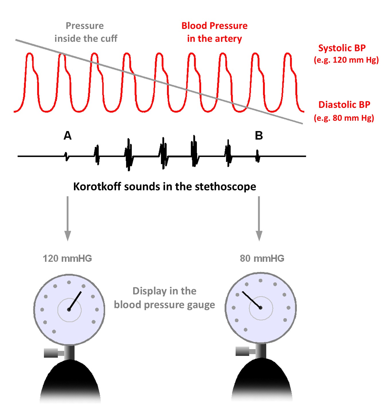 الصوت الأول للقلب والذي يسمى أيضاً بالصوت الانقباضي (Systolic Sound) ينتج هذا الصوت بسبب قفل الصمامات الأذينية – البطينية (الثلاثي والثنائي الشرفات). وجود الدم داخل البطينين يزيد من الضغط داخلهما ويعمل على تكوين ضغط انقباضي، يندفع الدم بفعل الضغط الانقباضي للبطينين إلى أعلى مما يسبب في قفل هذين الصمامين لمنع رجوع الدم إلى الأذينين. هذا القفل ينجم عنه ما يسمى بالصوت الانقباضي او الصوت الأول للقلب ويمكن سماعه في صورة LUB الذي يمتاز بضخامة وطول نغمته.