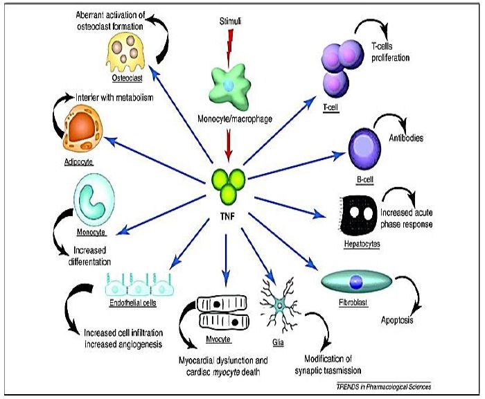 عامل النخر الورمي Tumor Necrosis Factor وهو بروتين ينتج بشكل رئيس من الخلاياMonocytes , Macrophages وكذلك ينتج من الخلايا الصارية Mast Cells والخلايا القاتلة الطبيعية Natural Killer Cells وغيرها من خلايا الجهاز المناعي استجابة لبعض السموم الداخلية Endotoxins ويؤدي الى حدوث الالتهابات ، ويقتل خلايا الورم او يمنع تكونها ويعمل على تنظيم فعاليات الخلايا المناعية ويولد الحمى ويؤدي الى استماتة الخلايا . تتاثر وظائفه بالعديد من الامراض مثل الزاهيمير والاكتئاب والتهاب الامعاء.
