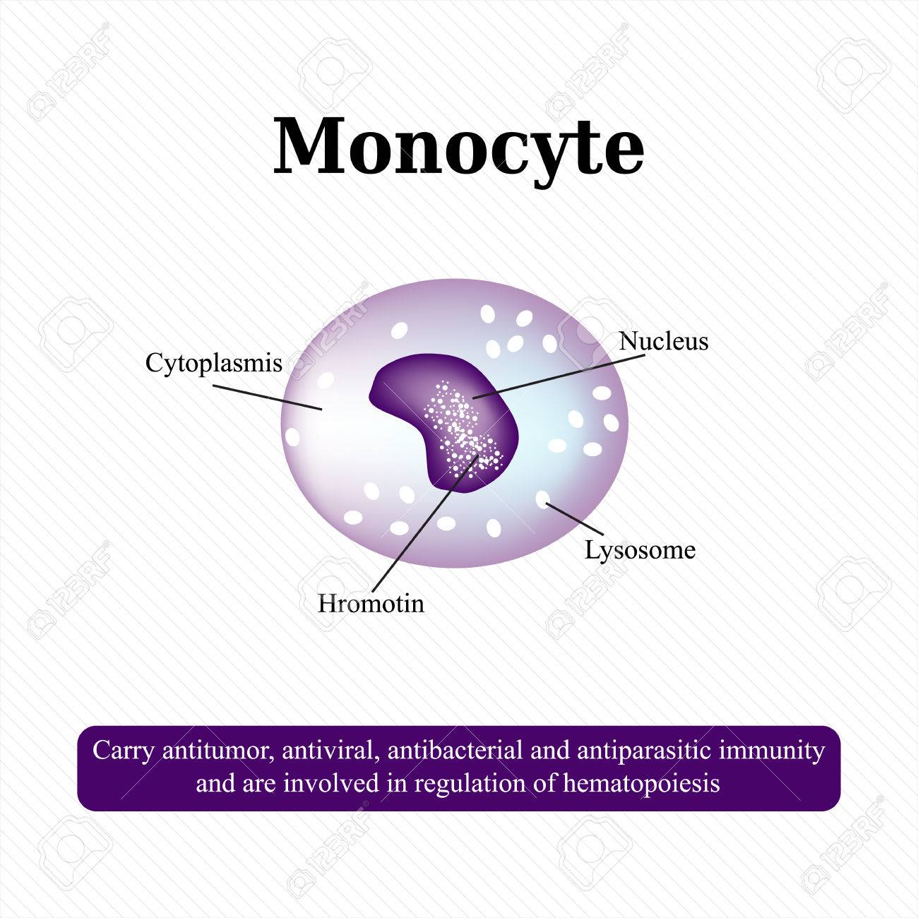 الخلايا وحيدات النوى Monocytes ويبلغ عددها ما بين 200-800 خلية لكل ميكرولتر، تتميّز باحتوائها على نواة واحدة مطويّة، ويكون لون السيتوبلازم متبايناً بين الأزرق والرّمادي، ويمكن أن يحتوي على بعض الفجوات والحُبيبات، وتكمن وظيفتها في مواجهة العدوى المزمنة