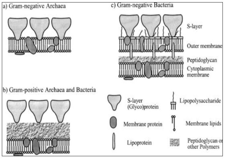 الطبقات الخارجية (Surface Layers) لبعض أنواع البكتريا تتكون من مكررات لوحدات بروتينية أو بروتينات سكرية تترتب بشكل رباعي أو سداسي، فهي تغطي الجدران الخلوية في البكتريا الموجبة لصبغة كرام وتغطي الأغشية الخارجية في البكتريا السالبة لصبغة كرام ، وفي بعض أنواع الأركيا تكون S Layers هي الجداران الخلوية أي تقع مباشرة حول الأغشية الخلوية ويمكن أن تكون الطبقات مضاعفة كما في بعض سلالات Bacillus وAquaspirillum .