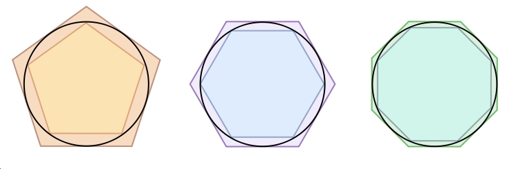 عمليا، كلما كبر عدد الأضلاع، صار بالإمكان الاقتراب من المساحة الحقيقية أكثر. وبذلك يُحصل على تقريب لمساحة الشكل عندما «نستنفد» كل القيم الممكنة بدقة معينة (مثلا: رقمين بعد الفاصلة).