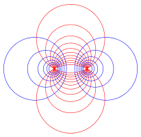 الدوائر الأبولونية، كل دائرة زرقاء تتقاطع مع كل دائرة حمراء بزاوية قائمة، والعكس صحيح