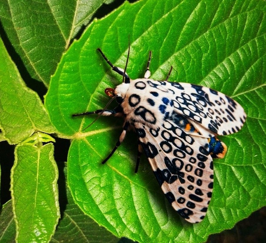 الفراشة الفهد العملاقة (Giant Leopard Moth) أو ذات العيون (Hypercompe scribonia) هي فراشة ليلية كبيرة ومذهلة، تنتشر في أمريكا الشمالية. تتميز بأجنحة بيضاء لامعة مغطاة ببقع سوداء دائرية تشبه العيون، ويصل باع جناحيها إلى 7.6 سم تقريباً، بينما يمتزج لون بطنها الأزرق الداكن بلمسات برتقالية، وتنشط ليلاً.
