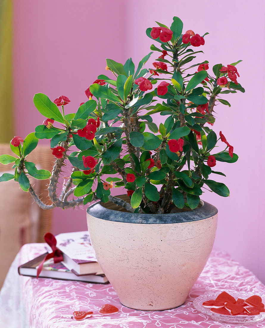 هو عبارة عن شجيرة عصارية سيقانها خشبية ذات أشواك كثيرة وتحمل السيقان أزهار صغار تحاط بقنابة حمراء جميلة، ويزهر من الربيع حتى نصف الصيف، يظهر من النبات عند قطعه عصارة سامة قد تسبب التهاباً في الجلد عند ملامسته.