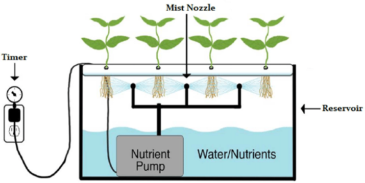 هي طريقة لنمو النباتات حيث تثبت النباتات في فتحات (ثقوب) في لوح من الستيروفوم وتكون جذورها معاقة في الهواء تحت لوح الستيروفوم الذي يشكل غطاء محكم للصندوق أو الحاوية بحيث يمنع الضوء ويثبت الجذور ويمنع نمو الطحالب. يرش المحلول المغذي على شكل رذاذ او ضباب دقيق حول الجذور كل 2-3 دقائق ، هذا كافي لجعل الجذور رطبة أو مبتلة ويجعل المحلول المغذي مشبعاً بالأكسجين، وتحصل النباتات على الماء والغذاء من غشاء المحلول الملتصق على الجذور...