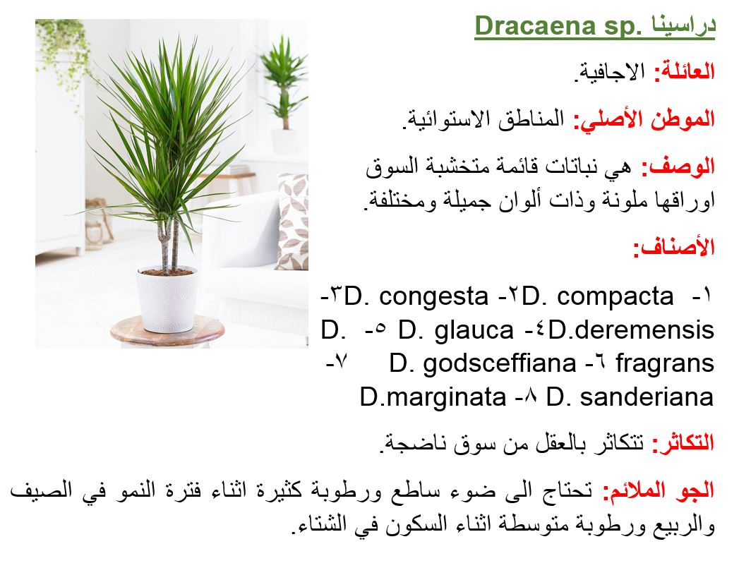 نبات قائم ساقة سميكة، ذو اوراق كبيرة الحجم مبرقشه باللون الذهبي او الابيض او الكريمي. يتميز النبات بجمال اوراقه الكبيرة المبرقشة، يستعمل لأعمال التنسيق الداخلي في المنازل او المكاتب والصالونات. يستخدم النبات الكبير كنموذج فردي والصغير كعنصر رئيسي في المجموعات. عصارة النبات لها تأثير سام على الفم والحلق لذا يجب وضع النبات بعيدا عن متناول الاطفال. يتكاثر بالعقل الساقية والخلفات.