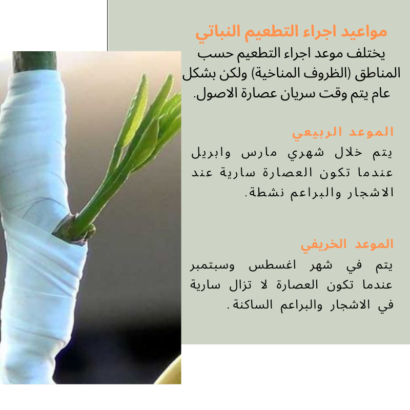 يختلف موعد اجراء التطعيم حسب المناطق (الظروف المناخية) ولكن بشكل عام يتم وقت سريان عصارة الاصول.