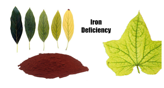 تتمیز أعراض نقص الحديد بظھور لون أصفر بین العروق فى الأوراق الحدیثة، ومع استمرار نقصه یتحول لون الأنسجة بین العروق إلي اللون الأبیض العاجي، وتظل العروق خضراء اللون، وفي حالات النقص الشدید قد تصبح الأوراق الصغیرة جداً كلھا صفراء.