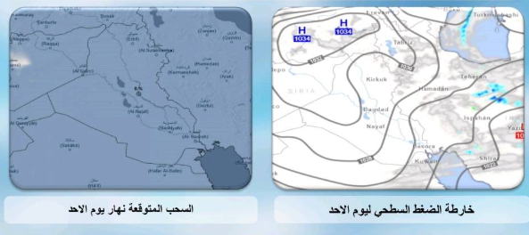 الطقس: تتأثر البلاد بمرتفع جوي متمركز على تركيا، ليكون الطقس صحواً بشكل عام مع ظهور بعض الغيوم على فترات، يتحول ليلاً إلى غائم جزئياً. ويتشكل ضباب كثيف خلال ساعات الصباح في مناطق محدودة من المنطقة الشمالية، على أن يزول تدريجياً مع تقدم ساعات النهار درجات الحرارة خلال ساعات النهار تسجل مقاربة ليوم أمس في المنطقتين الوسطى والشمالية، وتنخفض بضع درجات في المنطقة الجنوبية. وتكون الأجواء شديدة البرودة ساعات الصباح والليل خصوصا المنطقتين الوسطى والشمالية نتيجة لانخفاض درجات الحرارة بضع درجات.