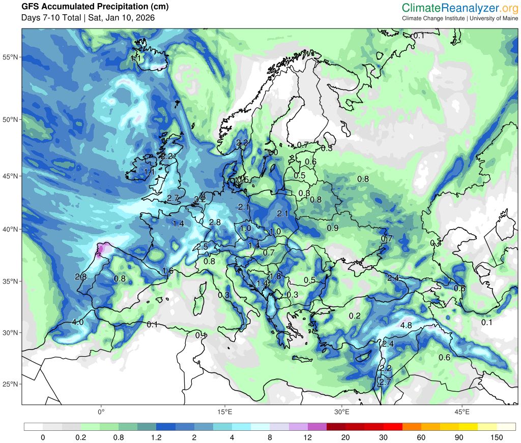 استقرار تام بالأجواء مع برودة ملحوظة هذا الأسبوع طبقا لخرائط الطقس وخلال نهاية الأسبوع ستتأثر البلاد بحالة جوية ممطرة والخارطة تمثل تراكم كمية الامطار المتوقعة للفترة من 8 إلى 10 كانون الثاني 2026 (بوحدة السنتيمتر).