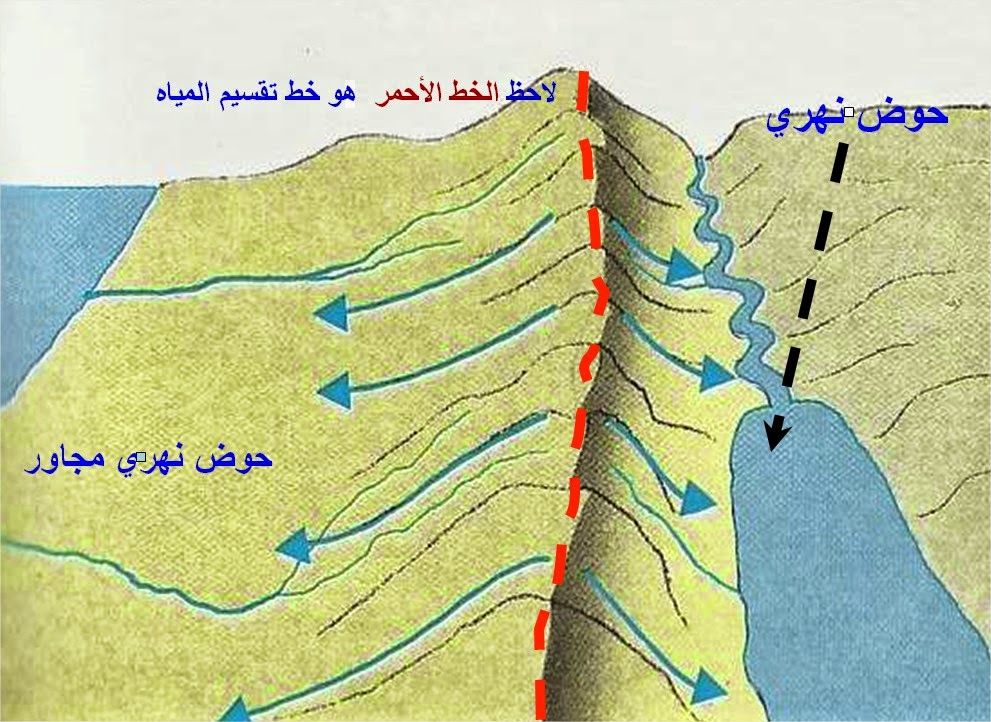 حوض التصريف: ويعني جميع الأراضي المحيطة بمجرى الوادي في المناطق الجافة التي تزودها بالمياه عن طريق الجريان السطحي أو الجوفي، ويفصلها عن الأراضي الأخرى أراضٍ مرتفعة تمثل أعلى نقطة فيها منطقة تقسيم المياه بين حوض وآخر.