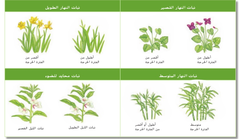 أ- نباتات النهار الطويل: هي النباتات التي تزهر اذا تعرضت لفترة ضوئية تتراوح بين (14-16 ساعة / يوم) مثل الخس و ورد الجمال.