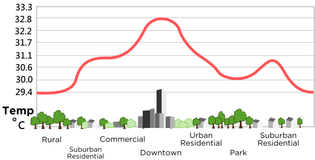 الجزيرة الحرارية:هو مصطلح يصف المناطق المبنية التي هي أكثـر سـخونة مـن المنـاطق الريفيـة المجاورة بحيث يبلغ المعدل السنوي لحرارة الهواء فـي مدينـة يبلـغ عـدد سـكانها مليـون شـخص أو أكثر من(١-٣ درجة مئوية) أكثر دفئا من المناطق المحيطـة بهـا فـي المسـاء ، والفـرق يمكـن ان يصل الفرق الى (12درجة مئوية),او هي منطقة ذات درجات حرارة أعلـى مـن المنـاطق المحيطـة بهـا ،لان درجـة الحرارة المتوسطة في المدن اكبـر بحـوالي درجـة مئويـة واحـدة ممـا هـي عليـة فـي الريـف المجاور، ويتضح هذا في فصل الشتاء بوجه خاص.