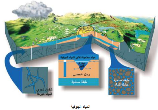 المياه الجوفية (الباطنية) : يقصد بالمياه الجوفية هو ما يوجد في باطن الأرض من مياه تسربت اليها من مياه الامطار الساقطة أو من المياه السطحية الأخرى والثلوج الذائبة، وتظهر المياه الجوفية الى سطح الأرض اما بصورة طبيعية كالعيون والينابيع أو عن طريق تدخل الانسان وذلك بحفرها مثل الابار الارتوازية.