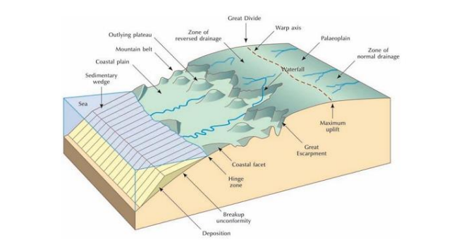 تضاريس الحافة النشطة margin landforms – Active : عندما تتقارب الصفائح التكونية أو تنزلق بجانب بعضها البعض، يقال أن الحافات القارية نشطة وإن أشكال التضاريس الأساسي المرتبطة بالحافات المتقاربة هي أقواس الجزر و الحزمة الجبلية. وتعتمد أشكالها على ما الذي يحدث لتقارب قارتين, ما إذا كان يحدث غوران Subduction للقشرة المحيطية أو يحدث تصادم. يعتقد أن الغوران Subduction ينشأ حافات حالة ثابتة بمعنى إن القشرة المحيطية تغور بينما يقاوم القارة الغوران .ويعتقد أن التصادمات Collisions تحدث عندما تتصادم أقواس .
