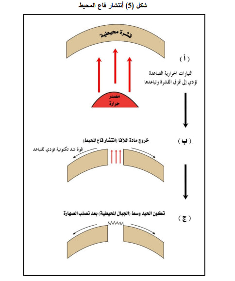 نظرية انتشار قاع المحيط : إن هذه النظرية ركن من أركان نظرية تكتونية الألواح. توضح أن سطح الكرة الأرضية مكون من ألواح محيطية وقارية، وأنها في حالة حركة مستمرة بسبب التيارات الحرارية الصاعدة من باطن الأرض تعمل هذه التيارات على ابتعاد الألواح بعضها عن بعض تسمى حدود متباعدة مما يؤدي إلى انبثاق مادة الصهير على طول هذه الحدود لتكوين قيعان المحيطات وبهذه الطريقة تتسع قيعان الأحواض المحيطية، وتسمى كذلك حدود بناءة لأن انبثاق مادة الصهير تعمل على بناء القشرة الأرضية المحيطية ويتكون بموجبها سلاسل جبلية .
