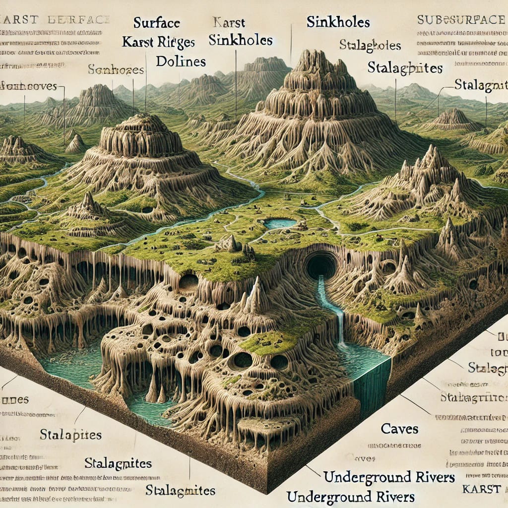 العمليات الكارستية :ـ هي العمليات الجيومورفولوجية الناتجة عن تأثير المياه الجوفية أو السطحية على الصخور القابلة للذوبان، مثل الحجر الجيري، الجبس، والدولوميت. تحدث هذه العمليات نتيجة لذوبان المعادن المكونة للصخور بفعل التفاعل مع المياه المشبعة بثاني أكسيد الكربون (CO₂).ومن شروطها :