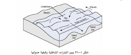 التيارات الشاطئية : تنتج بعض التيارات الشاطئية بسبب المد فكما تعلم ان الأمواج تتحطم على الشواطئ ثم تعود الى المياه مسرعة الي البحر ولكن في بعض الشواطئ التي يكون بها تحطم الأمواج عاليا فان نحت وتآكل في الرمال يحدث مكونا اما عوارض رملية او انخفاضات رملية تتجمع بها المياه في شكل موازي للشاطئ وعندما تتجمع هذه المياه بشكل كافئ خلف هذه العوارض او الانخفاضات الرملية فان هذه العوارض تنهار مكونة تيارا قويا متجها نحو الماء مما يهدد حياة الكثير من الناس بالخطر ويسمي هذا النوع من التيارات بالتيار القاطع .
